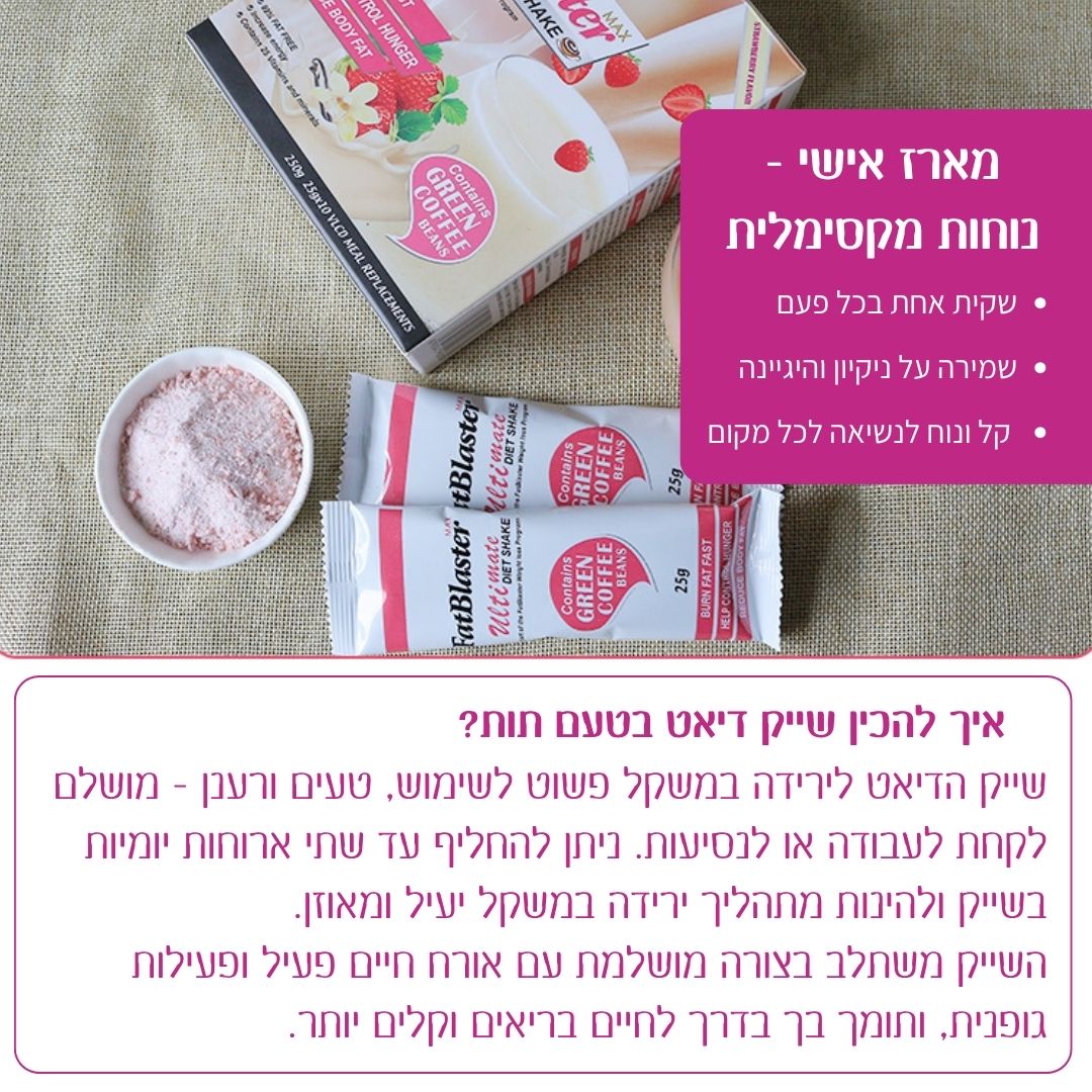 מומלץ להחליף עד שתי ארוחות ביום בשייק דיאט בטעם תות, ולצרוך בנוסף ארוחה מאוזנת בערב. השייק תומך בירידה במשקל כחלק מתפריט מגוון ואורח חיים בריא.