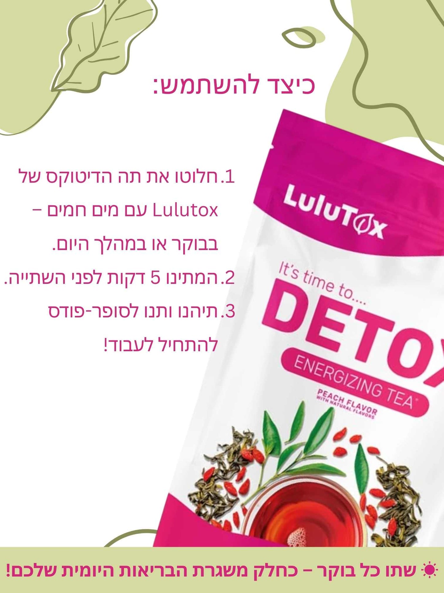 לולוטוקס תה דיטוקס טבעי לניקוי הגוף והפחתת נפיחות נועד לתמוך בניקוי רעלים עדין, להפחית נפיחות ולתרום לאיזון מערכת העיכול והחילוף. השילוב הצמחי מסייע לשגרה בריאה וקלילה כחלק מאורח חיים מאוזן.